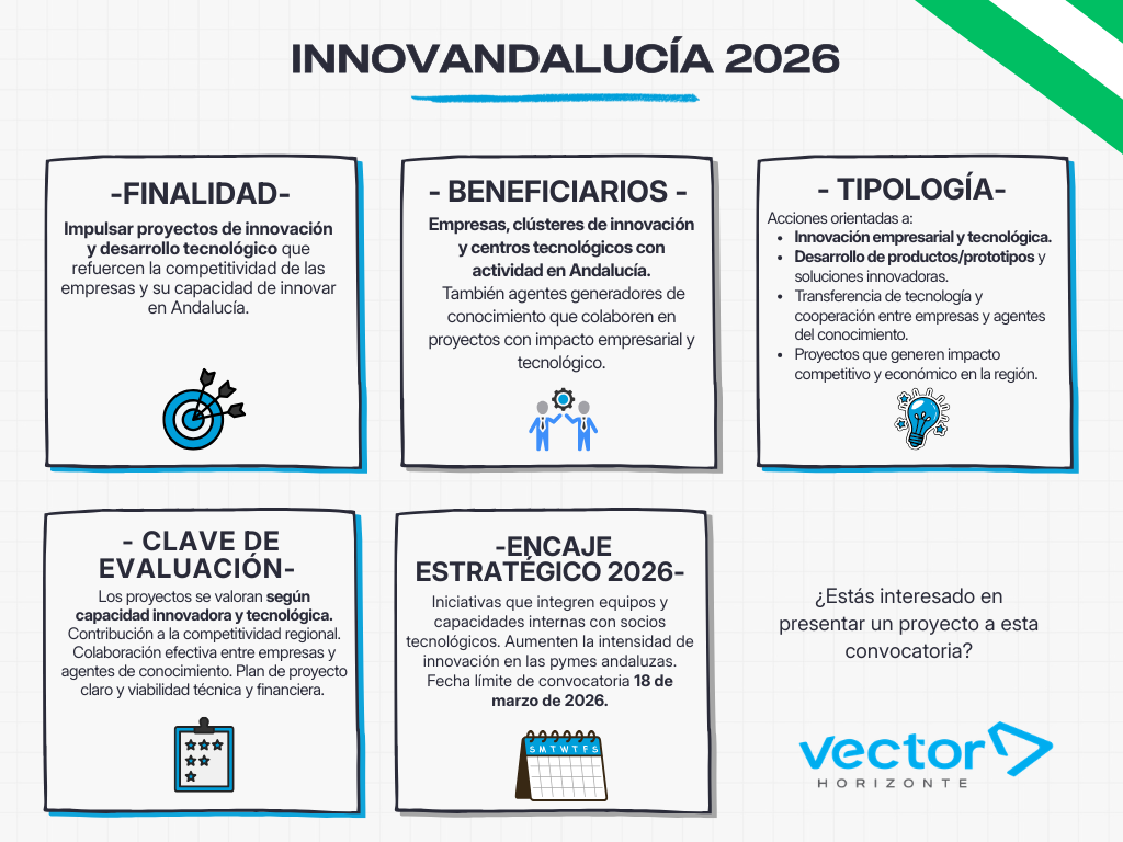En Vector Horizonte somos especialistas en transformar visiones tecnológicas en proyectos financiables de alto impacto. Si tu empresa tiene un proyecto que encaja en las Líneas 3 o 4 de InnovAndalucía, nuestro equipo de expertos puede ayudarte a realizar la propuesta individual o crear la estructurar del consorcio, definir el plan de trabajo y gestionar toda la tramitación para asegurar el éxito de tu solicitud.